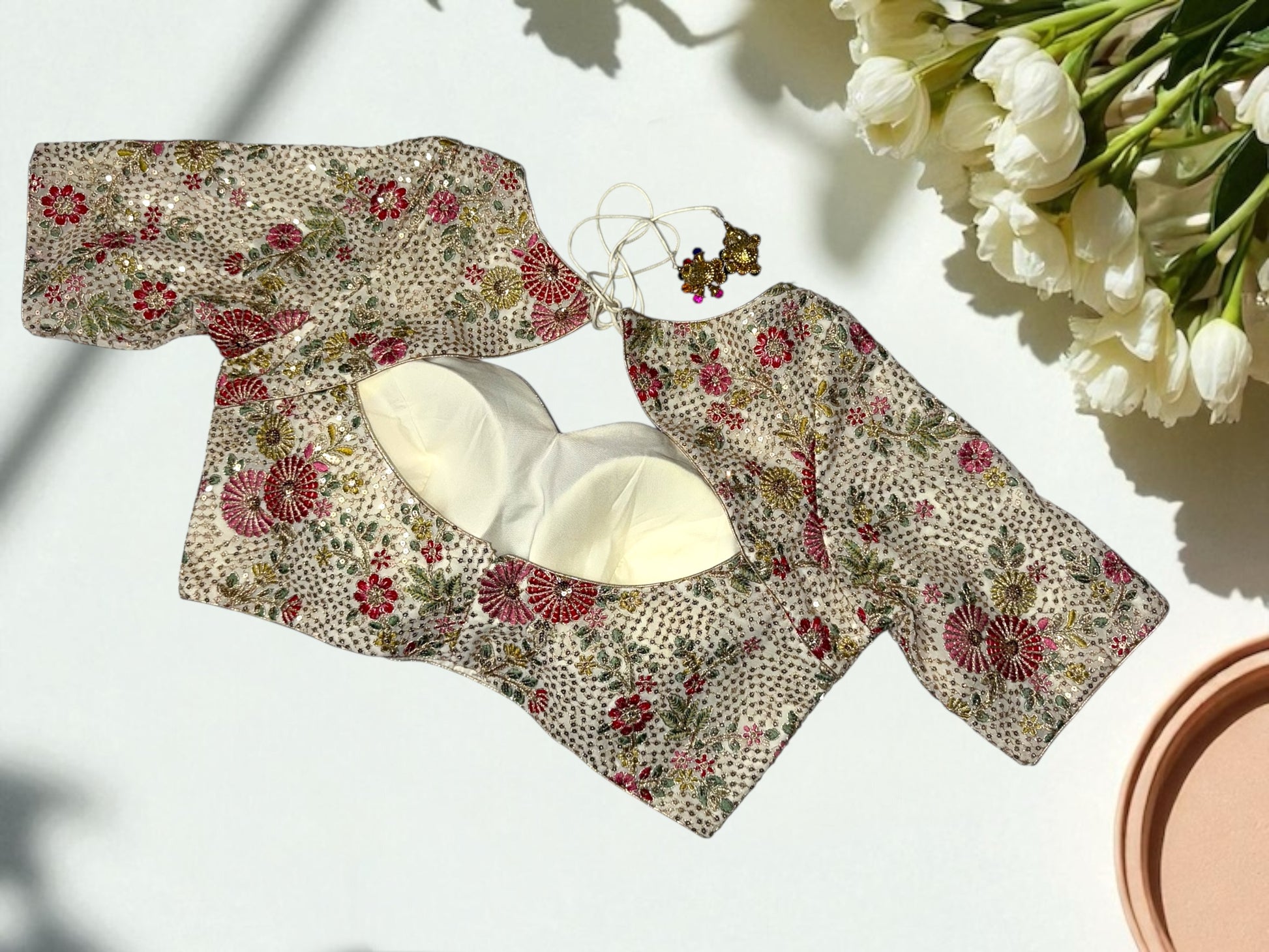 Elevate your wardrobe with this cream floral embroidered blouse, expertly crafted to blend classic elegance with intricate detailing. The delicate floral embroidery adds a refined touch, making it perfect for both formal occasions and stylish everyday wear. Its versatile cream color pairs effortlessly with a variety of outfits, while the high-quality fabric ensures comfort and durability throughout the day. Ideal for those seeking understated sophistication in their attire.