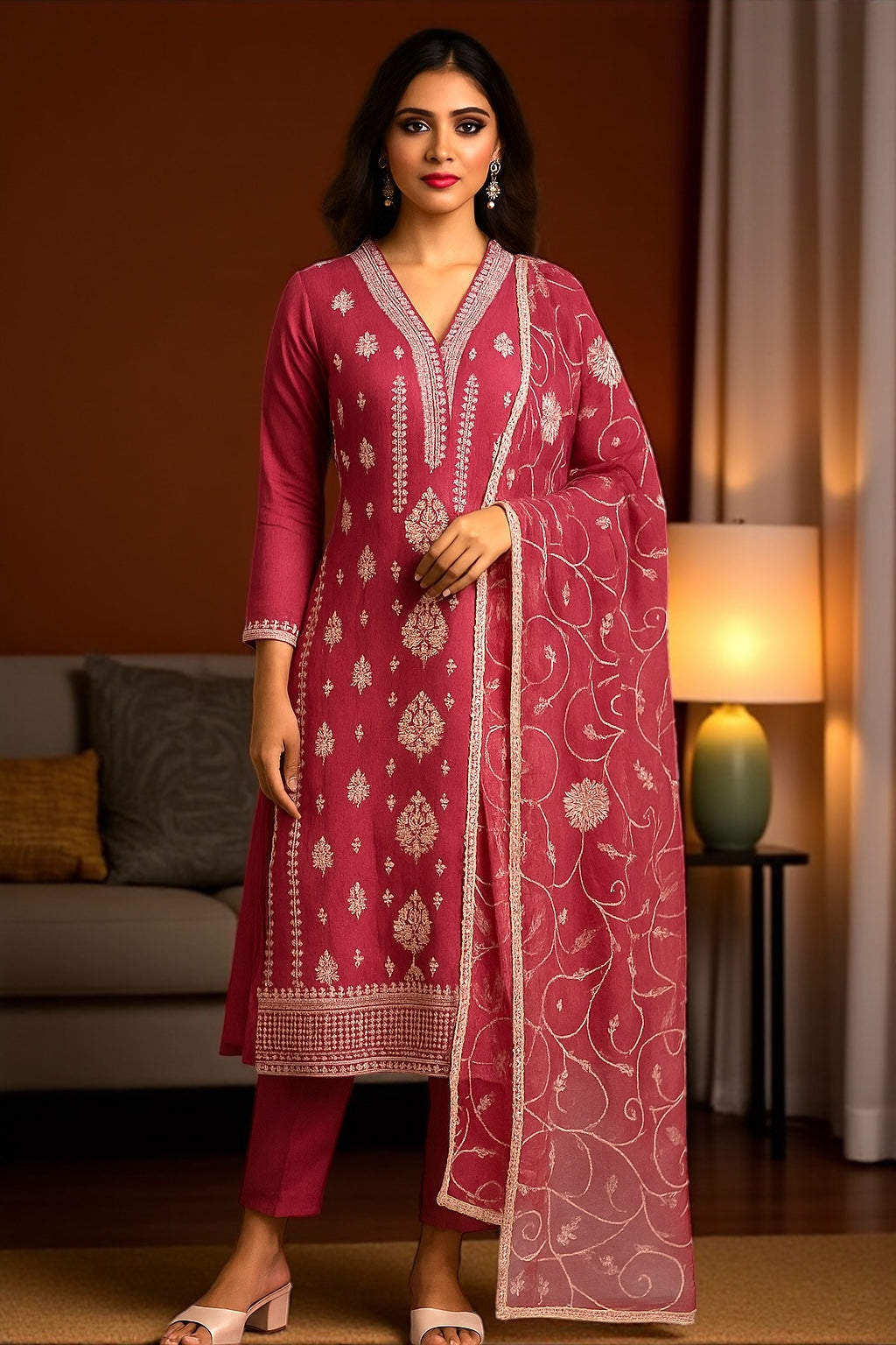 Elevate your ethnic wardrobe with this Dark Onion Pink Semi Crepe Stitched Salwar Suit. Crafted from semi crepe fabric, it ensures a smooth drape and subtle sheen, offering both comfort and style for extended wear. The rich dark onion pink hue adds a refined touch suitable for festive occasions or formal gatherings. Stitched to perfection, this suit combines traditional charm with modern tailoring, making it a versatile choice for elegant day or evening wear.