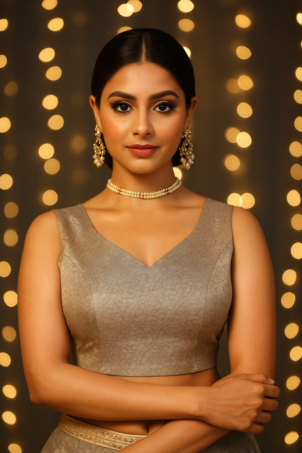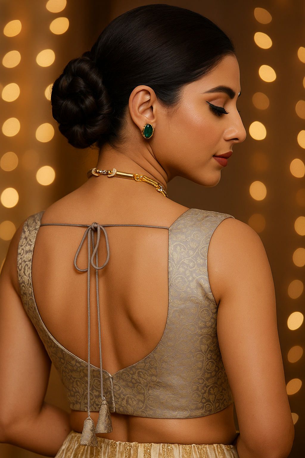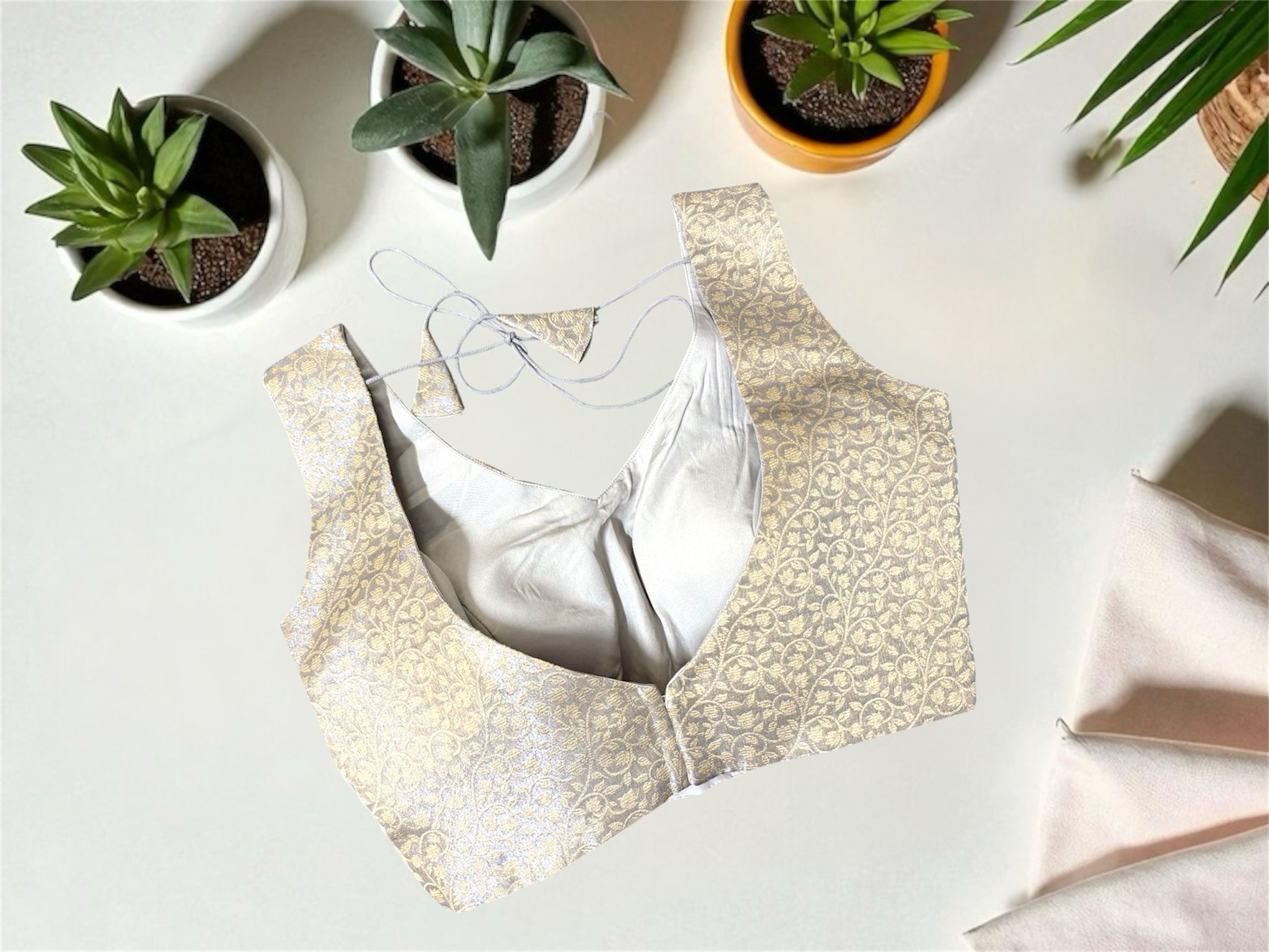 Experience timeless elegance with this Gray Banarasi floral blouse, crafted to complement traditional and contemporary ensembles. The intricate floral motifs woven into the rich Banarasi fabric showcase expert craftsmanship, ensuring a luxurious texture and subtle sheen. Its versatile gray shade pairs effortlessly with sarees or lehengas, elevating your style for festive occasions or sophisticated gatherings. Designed for a refined fit, this blouse brings together heritage artistry and modern sophistication for a graceful addition to your wardrobe.