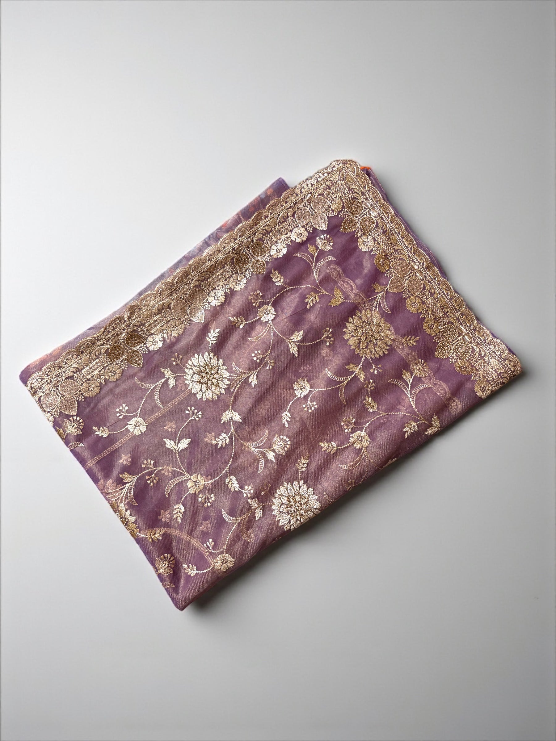 Crafted from fine tissue silk, this light brown saree showcases intricate zari work that adds a luxurious shimmer to the fabric. The delicate texture combined with detailed metallic embroidery creates an elegant garment ideal for formal occasions. Its breathable silk composition ensures comfort while making a refined style statement. This saree effortlessly blends traditional craftsmanship with sophisticated design, perfect for those who appreciate artisanal quality and subtle opulence.
